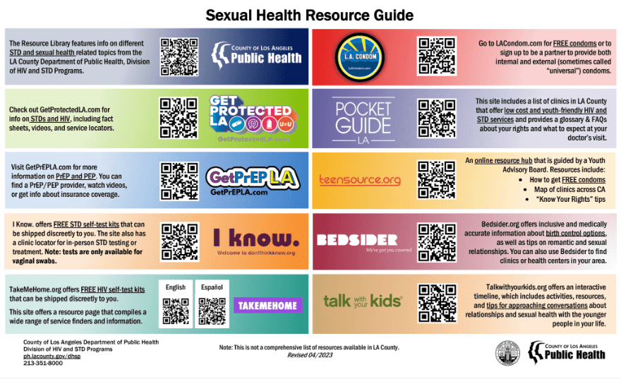 QR Code Sheet directing to various Sexual Health Resources in LA County, sized to Legal sheet of paper
